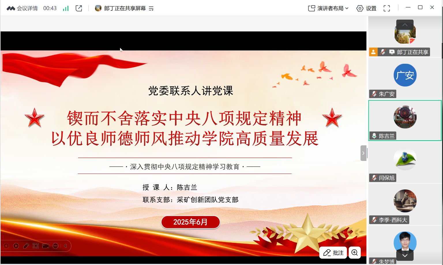 根据公司党委统一部署安排,2025年6月9日,公司党委书记陈吉兰同志为采矿创新团队党支部讲授题为“锲而不舍落实中央八项规定精神,以优良师德师风推动公司高质量发展”的专题党课。