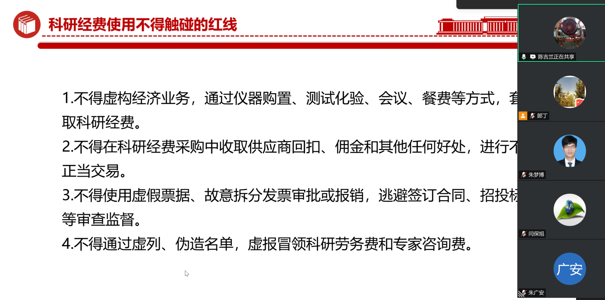 陈吉兰同志分别从“中央八项规定从制定到实施的重要节点、中央八项规定和中央八项规定精神的联系与区别、落实中央八项规定的宝贵经验、新时代新征程持续落实中央八项规定精神的措施、科研经费使用中的纪与法、结合工作实际锲而不舍落实中央八项规定精神”六个方面为大家系统梳理了落实中央八项规定精神的实质、内涵、重点任务,结合教师党员的工作实际重点对公司产品活动、科研经费使用管理等方面的工作提出了明确的纪律要求,通过丰富的警示案例为大家解读了日常工作生活中不能触碰的底线红线。