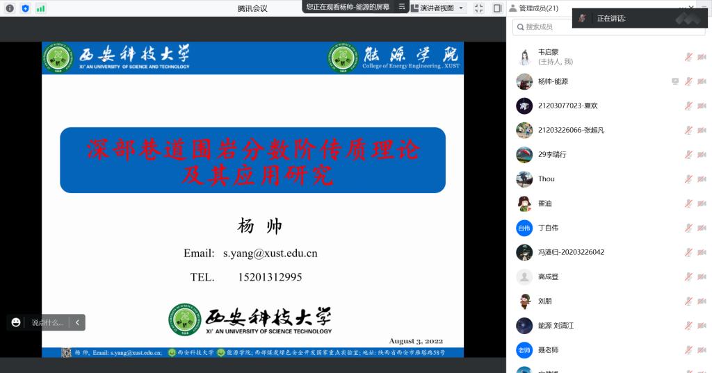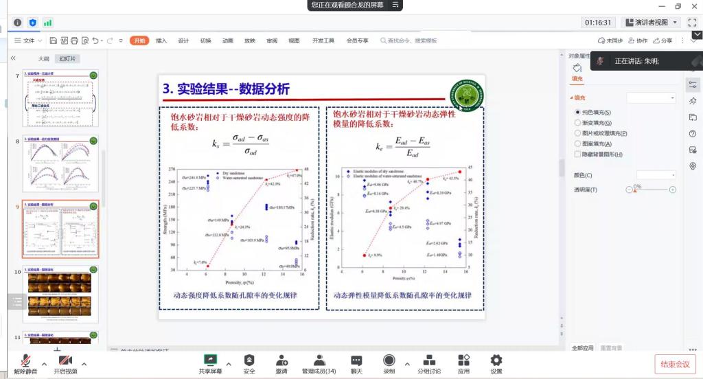 杨帅老师通过研究动机、分数阶微积分基础及多层低渗介质分数阶等三方面对深部巷道围岩分数阶传质理论及应用进行了深入浅出的介绍,从理论方面对非达西渗流模型进行了全面分析;顾合龙老师基于现场涌水、突水、雨后滑坡等实际情况,从实验程序、实验结果和力学机理对不同空隙度下饱水砂岩动力响应及细观劣化机理进行了详细介绍。