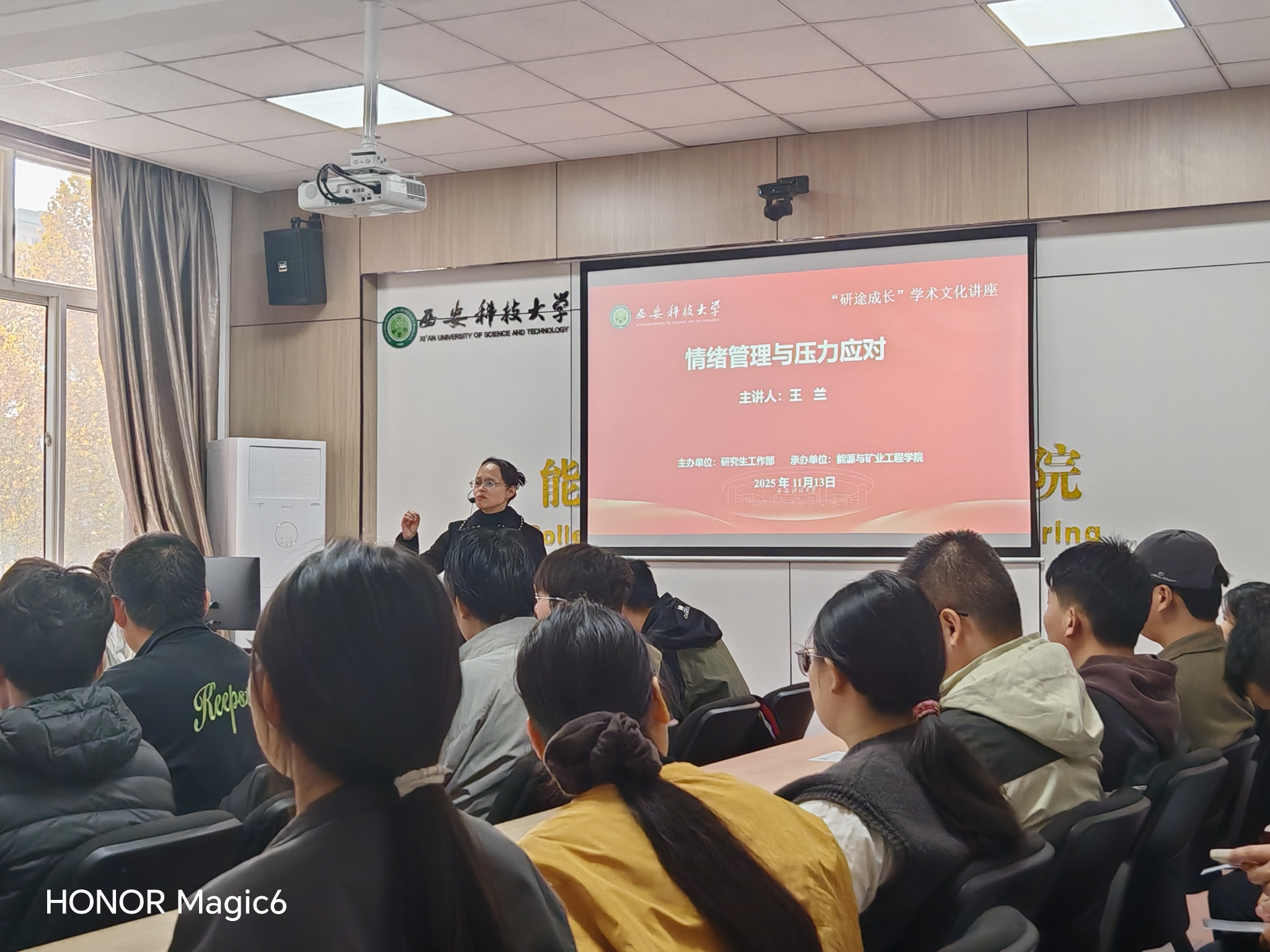 11月13日下午,在雁塔校区2-310会议室,国家二级心理咨询师王兰应邀主讲《情绪管理与压力应对》为专题的“研途成长”系列学术文化讲座。讲座由研究生辅导员宋晓华主持,约80人参加了此次讲座。