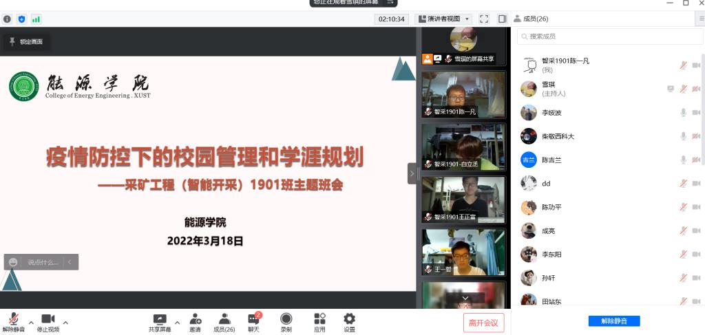 3月18日,z6mg人生就是博官网采矿工程(智能开采)1901班召开“疫情防控下的校园管理和学涯规划”线上主题班会,公司党委书记陈吉兰,经理柴敬,党委副书记李绥波,院办主任、公司党委组织员杨创明,班主任王红伟以及采矿工程(智能开采)1901班全体同学参加了会议。会议由辅导员王雪琪主持。