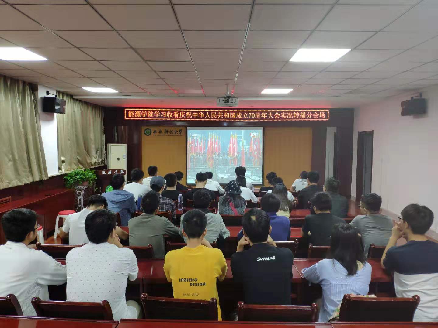 10月1日上午,庆祝中华人民共和国成立70周年大会在北京天安门广场隆重举行。中共中央总书记、国家主席、中央军委主席习近平发表重要讲话。公司组织员工通过不同方式收听收看了大会盛况,院团委副书记王雪琪带领员工代表在临潼校区骊山校园煤炭科技中心一楼报告厅观看了大会现场直播,同时,公司还组织员工在临潼校区公司会议室收看大会实况转播。会后,能源学子热议习近平总书记重要讲话,分享观看庆祝大会感想体会。