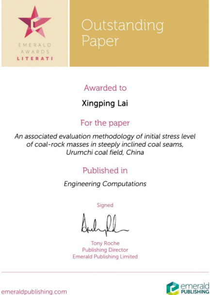 近日,英国爱墨瑞得出版社(Emerald Publishing)公布了2021年Emerald Literati Awards-Outstanding Paper入围名单,公司矿业工程学科来兴平教授团队发表在《Engineering Computations》文章“An associated evaluation methodology of initial stress level of coal-rock masses in steeply inclined coal seams,Urumchi coal field,China”获2021年度Emerald Literati Awards-Outstanding Paper奖。