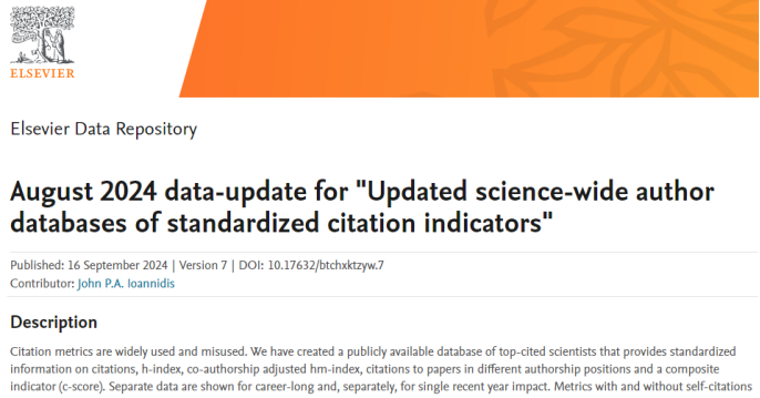 2024年版本中,增加了被撤论文的数据(基于撤稿观察数据库)以及被撤论文的引用/自引用情况。职业生涯数据更新至2023年底,单个最近年份数据与2023年期间所获引用有关。本版基于Scopus 2024年8月1日数据库,更新至2023年引文年末。因此计算使用的是截至2024年8月1日的所有Scopus作者简介。