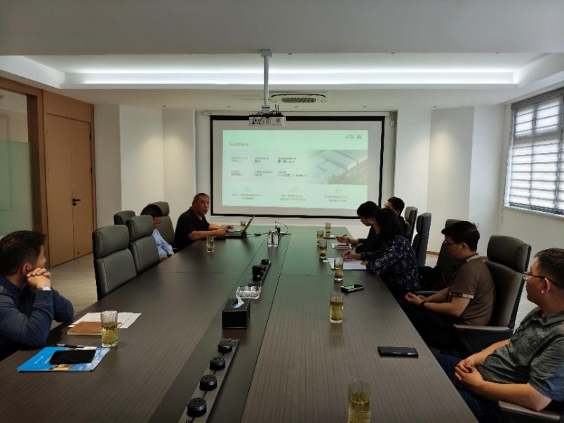 江阴尚驰机械设备有限公司作为光伏回转驱动领域的知名制造商,自2014年成立以来,便坐落于江苏省江阴临港新能源产业园,集研发、设计、生产制造、组装销售及服务于一体,综合实力雄厚。公司研发总监华伟向考察团介绍了公司发展历程及未来规划,展示了其在光伏回转驱动领域的技术实力和市场影响力。经过10 年快速发展,已在全球 TOP10 跟踪系统龙头企业中占据重要地位,客户遍布全球各地,出口比例 60% 以上,已在美国、欧洲设立办事处。双方就行业现状、人才需求、产学研合作等方面进行了探讨。